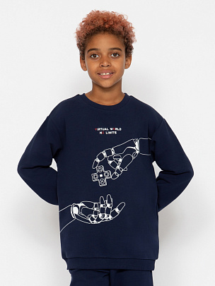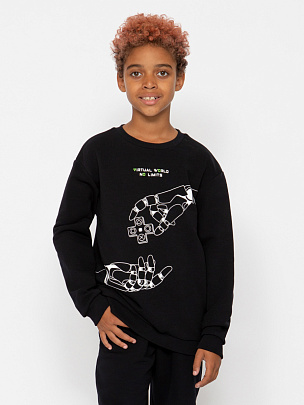 Джемпер из гладкокрашенного полотна, с притачной бейкой по горловине. Рукава длинные с манжетами. Низ изделия обработан притачным поясом. Декорирован принтом.