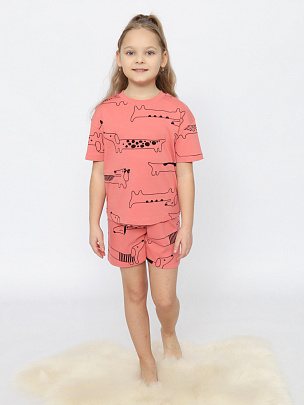 Пижама набивная из футболки и шорт. Футболка оверсайз с коротким рукавом. Горловина обработана притачной бейкой из рибаны с лайкрой. Шорты свободного покроя длиной до середины бедра. Цельнокроеный пояс обработан плоским швом вподгибку с одновременным прокладыванием резинки.