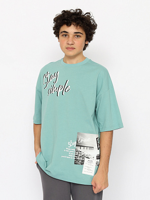Футболка прямого силуэта длиной до бедер. Короткий рукав. Круглая горловина обработана узкой притачной обтачкой из рибаны с эластаном. Полочка декорирована принтом и текстильной нашивкой "ясное будущее естественное и аутентичное".