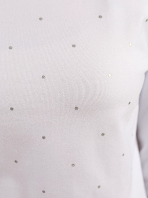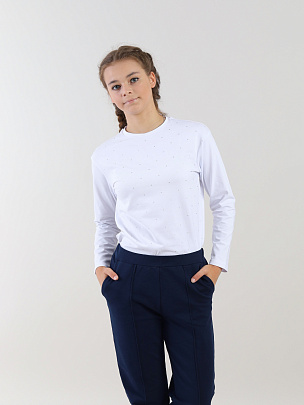 Джемпер свободного силуэта для девочки со спущенным плечом и длинными рукавами. Полочка декорирована принтом с блестящим эффектом. Воротник из основного полотна.