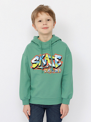 Толстовка для мальчика с капюшоном и карманами в боковых швах. Манжеты и пояс из эластичной рибаны. Внизу на полочке декоративная силиконовая нашивка.