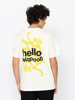 Прямая футболка для молодых мужчин с короткими рукавами. Горловина круглая, оформлена эластичным воротником. Футболка выполнена из кулирки повышенной плотности. Перед и спинка футболки декориованы принтом "никогда не сожалей", "привет", "пока".