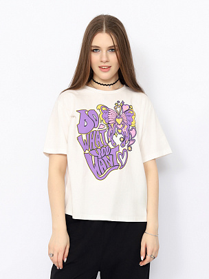 Футболка женская, из тонкого хлопкового трикотажа, украшена принтом.